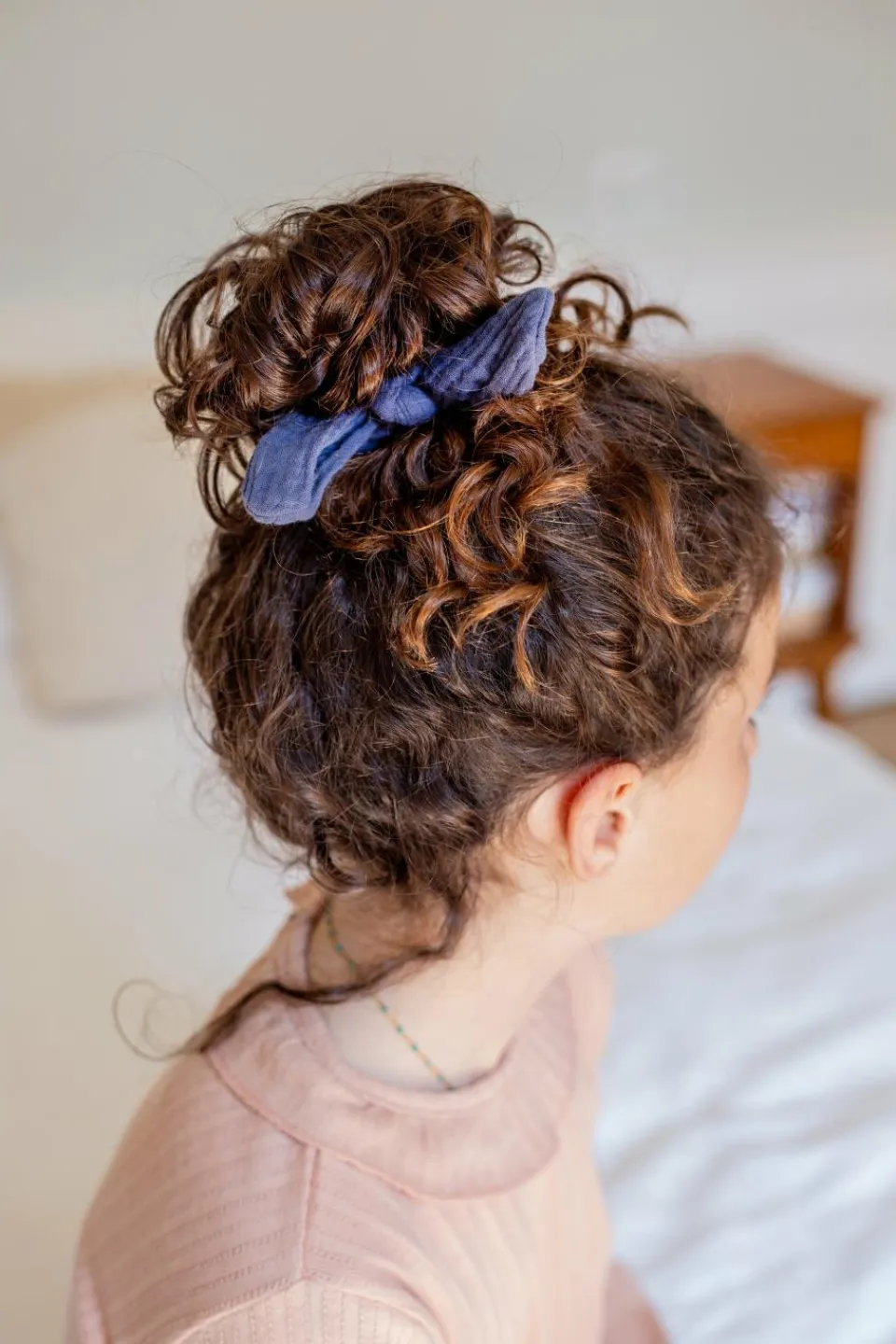 Chouchou en gaze de coton orné d’un nœud. A nouer sur une queue de cheval ou un chignon pour une coiffure rétro !