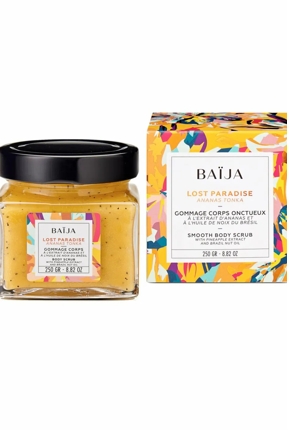 Sa texture onctueuse associe le sel de mer et les coques de Noix de Coco pour exfolier en douceur la peau et la débarasser de ses impuretés. L’extrait d’Ananas illuminateur et l’huile de Noix du Brésil nourrissante la subliment dès la première utilisation. Son parfum de fruits frais et de fleurs solaires invite au voyage, à la recherche d’un paradis exotique.