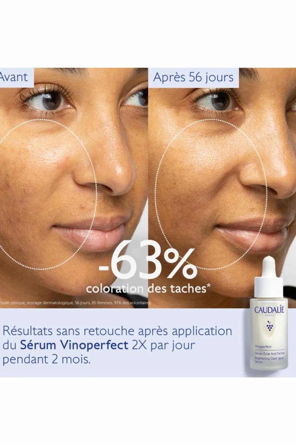 Résultats visibles avec -63% coloration des taches**Étude clinique, scorage dermatologique, 56 jours, 33 femmes, 91% des volontaires.