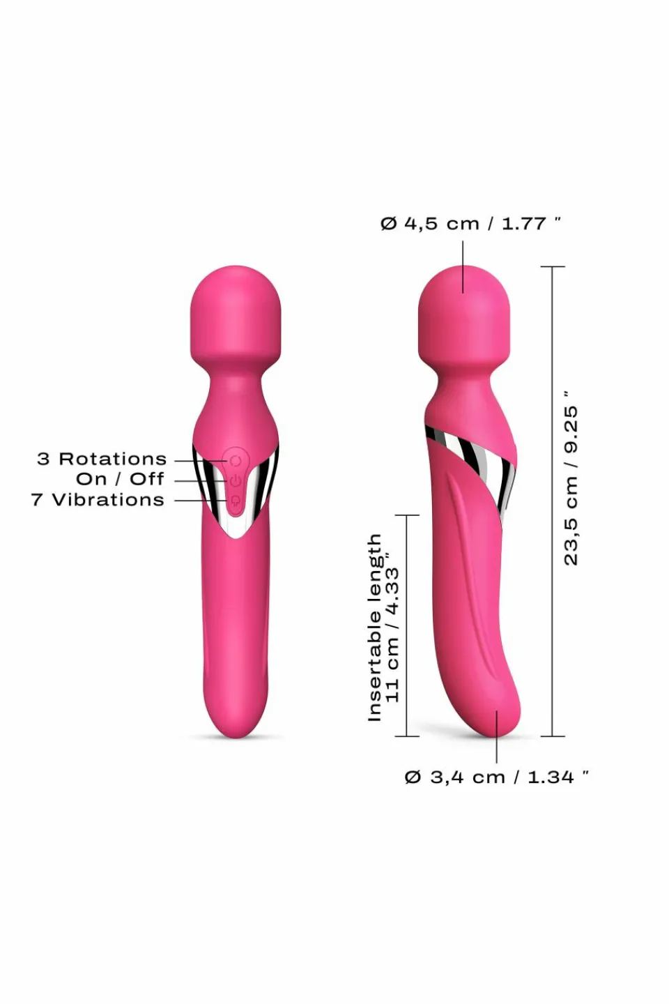 Le Dual Orgasms vous propose différentes façons de jouir. Vous pourrez choisir entre les 7 modes de vibrations de la boule du Wand et les 3 modes de rotation de la partie insérable. Les billes tournantes sont là pour masser puissamment les parois du vagin. À puissance maximum, la tête atteint les 330 tours à la minute !
