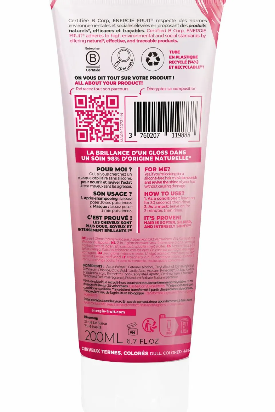 Le 1er Masque Gloss 98% d’ingrédients d’origine naturelle apporte aux cheveux colorés ou ternes une brillance intense, sans les agresser. Sa formule innovante contient un puissant complexe d’acides pour refermer les écailles du cheveu. Résultat, la lumière se reflète, les cheveux sont éclatants, nourris et protégés des agressions extérieures.