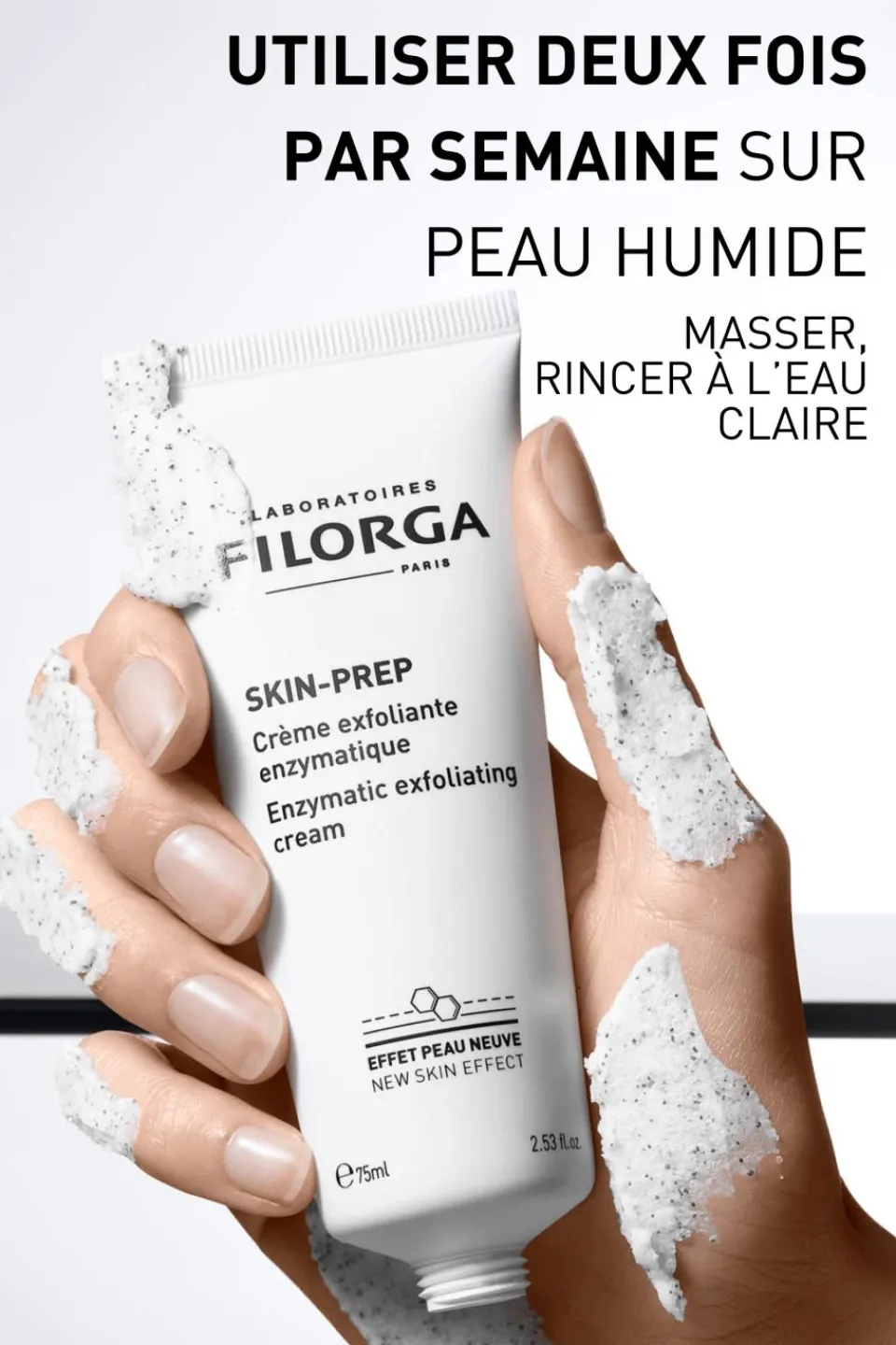 – Texture crémeuse exfoliante et fondante à la double exfoliation mécanique et enzymatique.