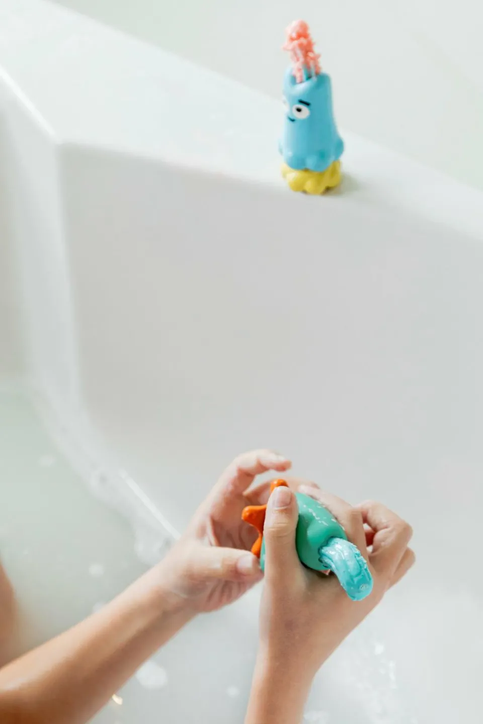 Pour jouer : Sortez la pâte à modeler du pot et laissez votre enfant créer des formes avec Floopy et Bloop. Une activité idéale pour stimuler leur imagination, même en dehors de la salle de bain.