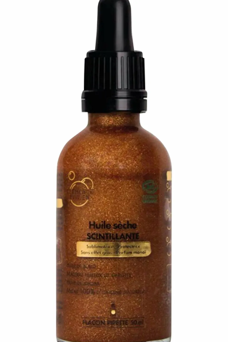 SUBLIMER : les nacres d’origine naturelle scintillent sur la peau pour parfaire le bronzage ou briller en soirée. (Huile de buriti et macérat huileux de carotte)