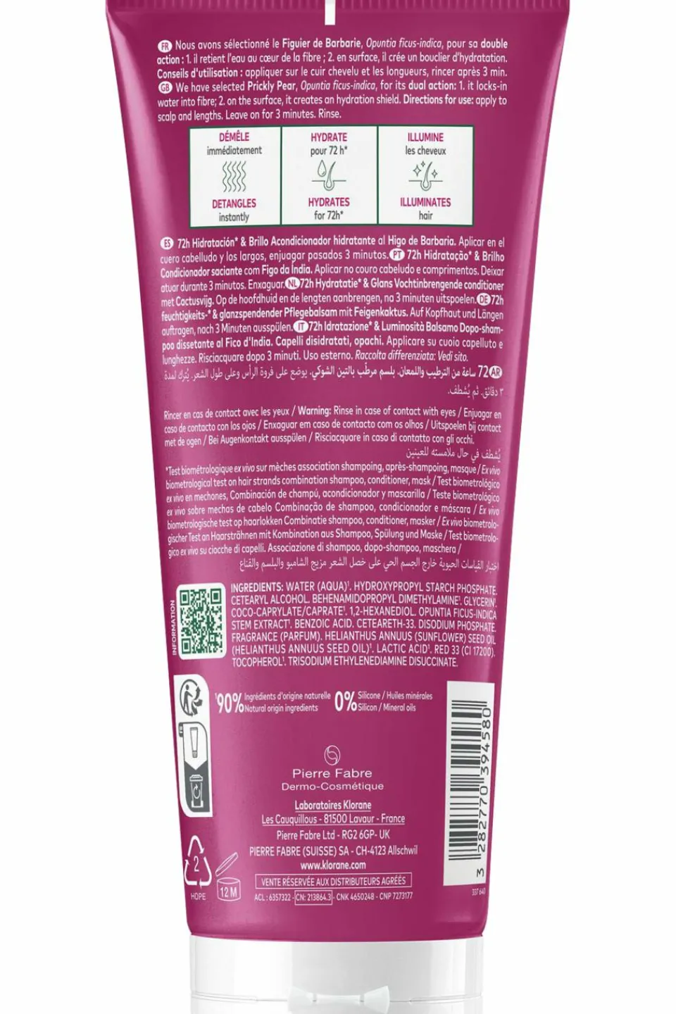 Formulé à 90% d’ingrédients d’origine naturelle, cet après-shampoing enrichi en Figuier de barbarie aux propriétés hydratantes supérieures à la glycérine** grâce à ses molécules hydrofixantes, est efficace pour hydrater et redonner souplesse, du cuir chevelu aux pointes.