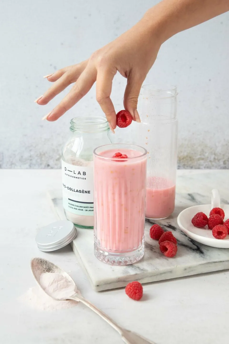 • Oligopeptides de collagène 1,88 g et oligopeptides d’élastine 120 mg (poisson, mollusque, crustacé) • Fructo-oligosaccharides 2 g • Poudre de jus de fruit de framboise – Rubus idaeus 1 g • Arôme naturel framboise • Poudre de fruit d’acérola – Malpighia glabra 235,3 mg titré en vitamine C 40 mg 50% AR1 ; • Poudre de jus de fruit de grenade – Punica granatum 200 mg • Acide hyaluronique 150 mg • Arôme naturel, glycosides de stéviol • Gluconate de zinc 34,8 mg dont zinc 5 mg 50% AR1 • Denrée alimentaire colorante (concentré de betterave rouge, carotte)