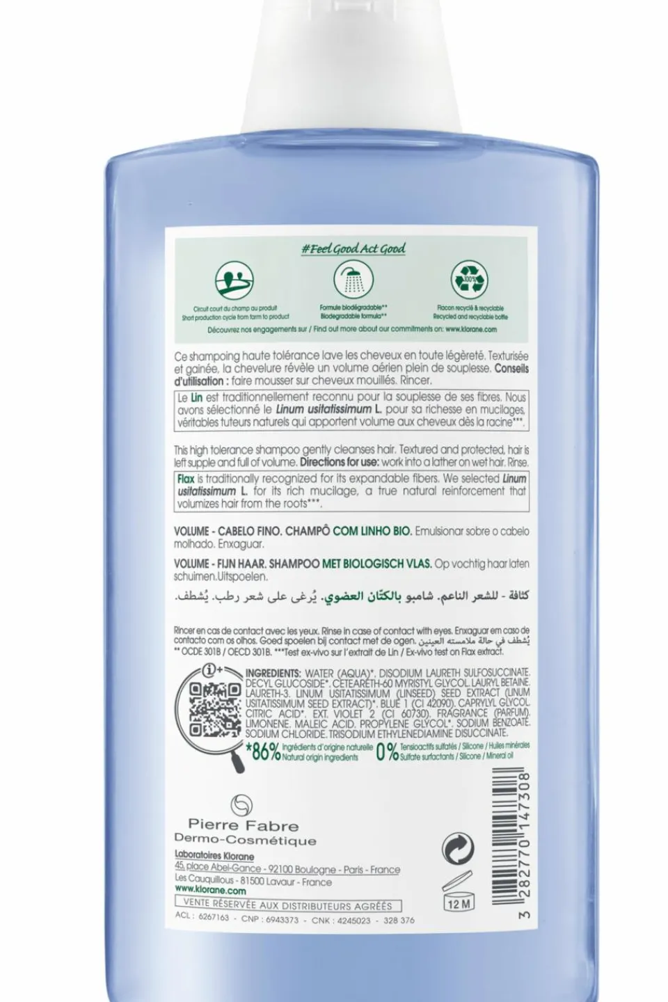 Avec sa formule ultra-légère à 86 % d’ingrédients d’origine naturelle, le Shampoing au Lin BIO de Klorane lave et texturise les cheveux fins en manque de volume. Riche en fibres de Lin BIO, cultivé et récolté en circuit court selon une Agriculture Biologique certifiée, il insuffle immédiatement un volume durable et naturel de la racine aux longueurs. Véritables tuteurs du cheveu, ces fibres végétales solubles sont reconnues pour leurs bienfaits capillaires**. Parfaitement propre, texturisée et gainée, la chevelure révèle un volume aérien et naturel, plein de souplesse.