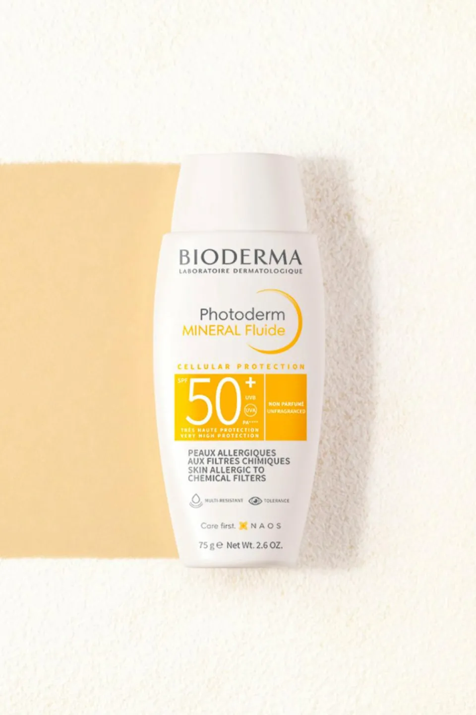 Photoderm MINERAL Fluide non parfumé, SPF50+, pour les peaux allergiques aux filtres chimiques et au parfum. Filtres 100% minéraux. Très haute protection UVA/UVB.