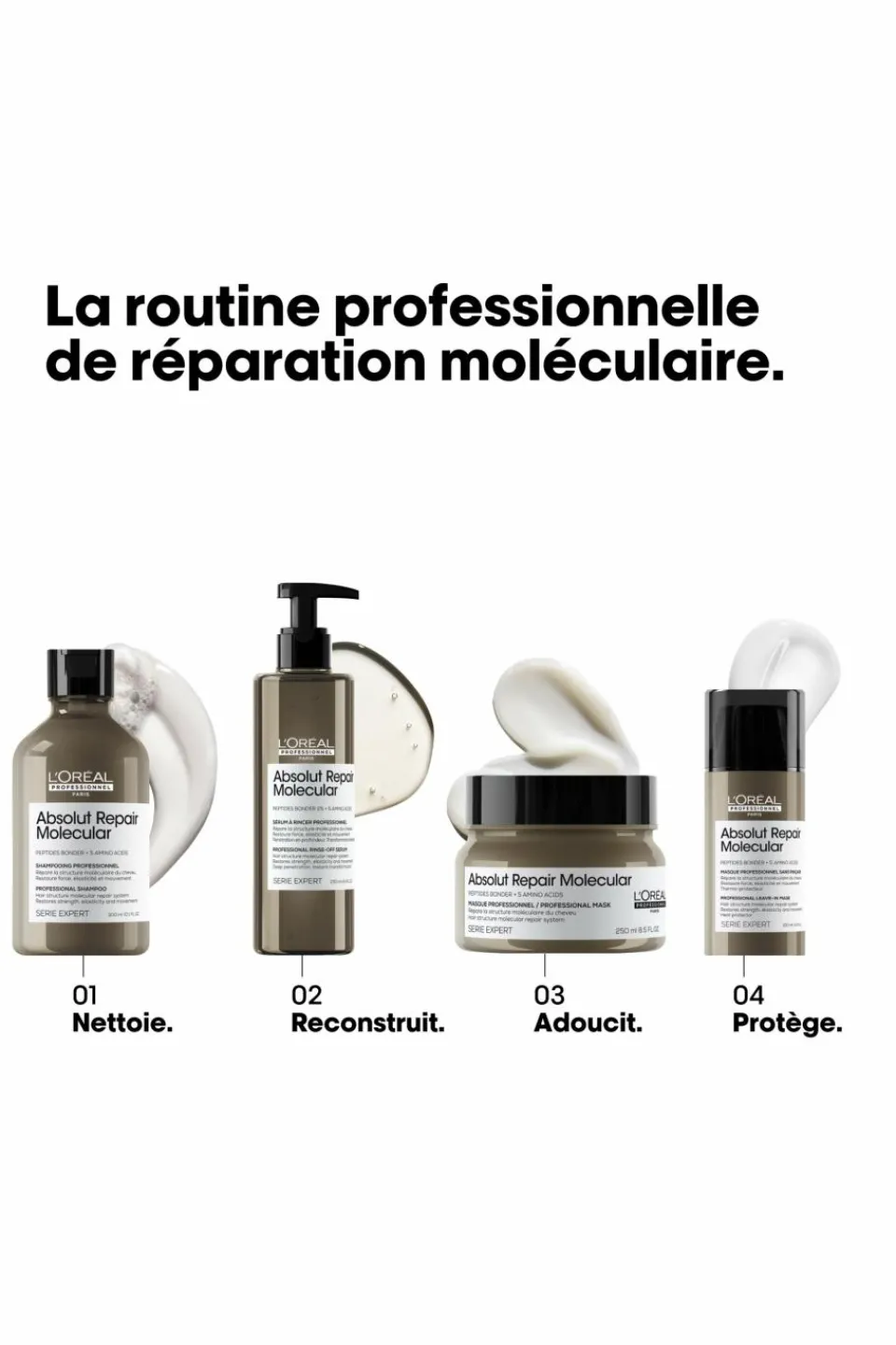 Le Masque Concentré Professionnel Absolut Repair Molecular hautement concentré avec du liant peptidique + 5 acides aminés répare 2 ans de dommages et repulpe les couches moléculaires du cheveu.