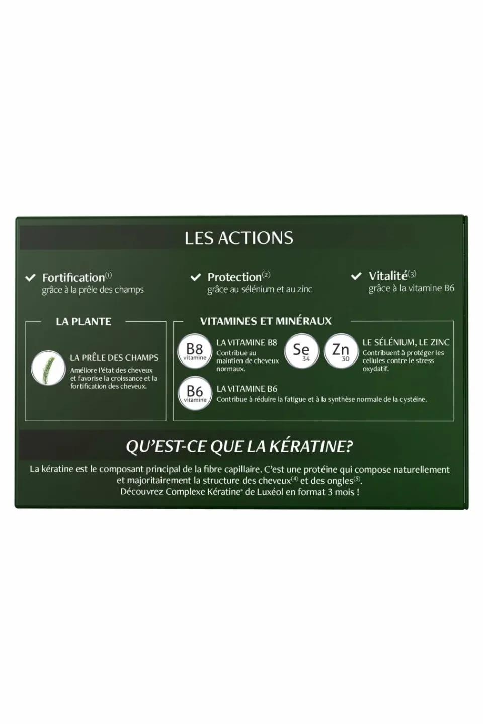 Kératine hydrolysée, poudre de partie aérienne de prêle des champs (Equisetum arvense) ; hydroxypropylméthylcellulose (enveloppe de la gélule d’origines végétales) ; L-méthionine ; L-cystine ; citrate de zinc, antiagglomérant : sels de magnésium d’acides gras ; chlorhydrate de pyridoxine (vitamine B6) ; D-biotine (vitamine B8) ; sélénite de sodium.