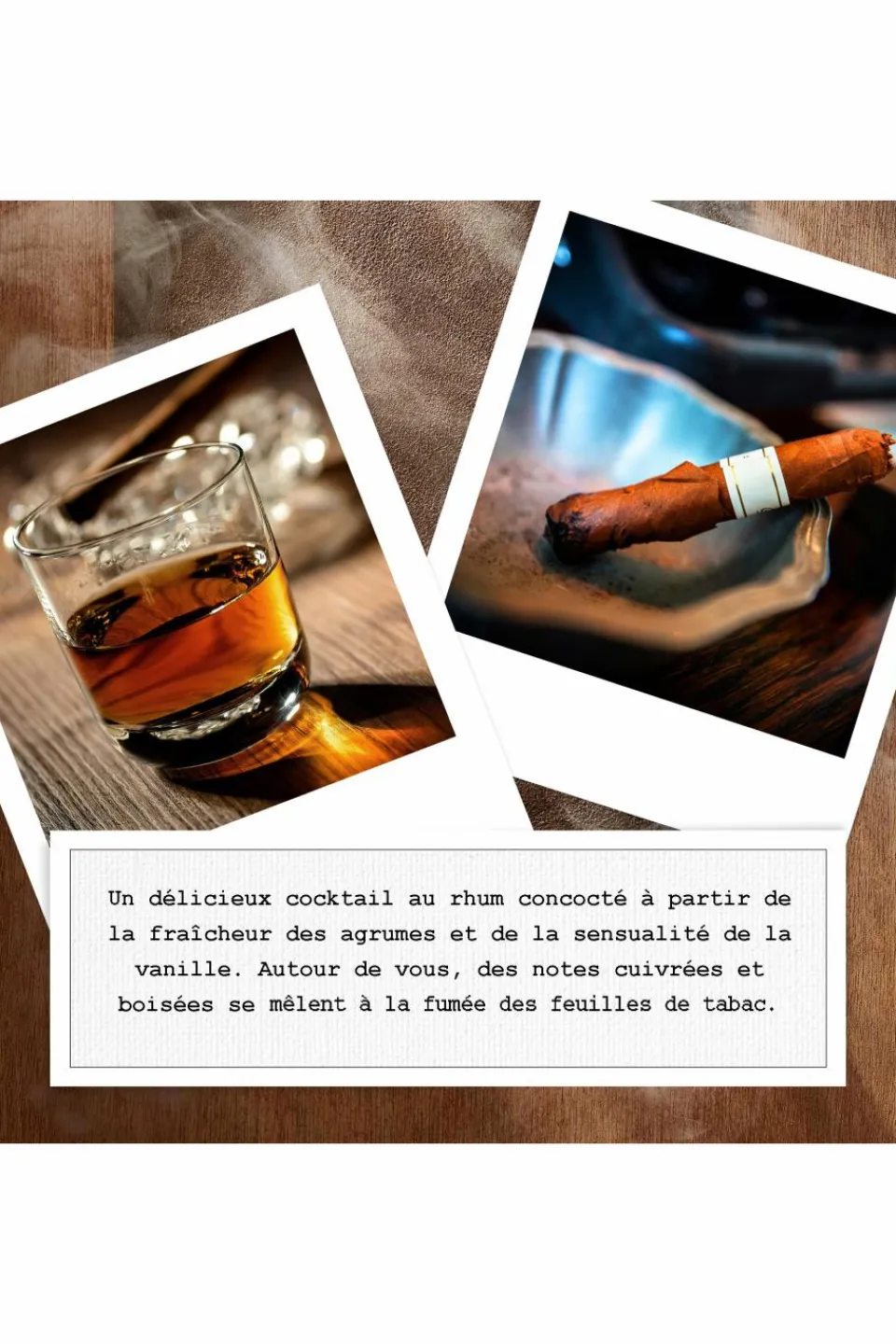 Son accord rhum joue avec des notes d’orange et d’orange amère, enrichies de sauge. Une note baumée, celle du styrax, s’ajoute en fond à la vanille, à la fève tonka, au vétiver et à l’absolu de feuilles de tabac, pour donner à l’ensemble une intonation à la fois cuir et liqueur.