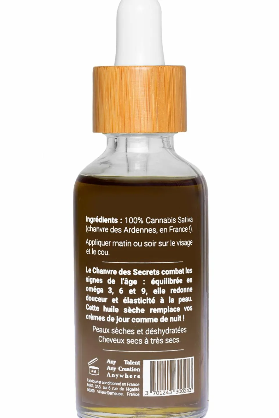 Le Chanvre de Secrets est un secret de beauté made in France bien gardé (Chanvre cultivé dans les Ardennes) ! Notre huile de chanvre pure combat les signes de l’âge comme aucune autre… Pourquoi ? Elle est parfaitement équilibrée en omega 3, 6 et 9 : cela lui confère des propriétés nourrissantes et hydratantes rarement égalées.