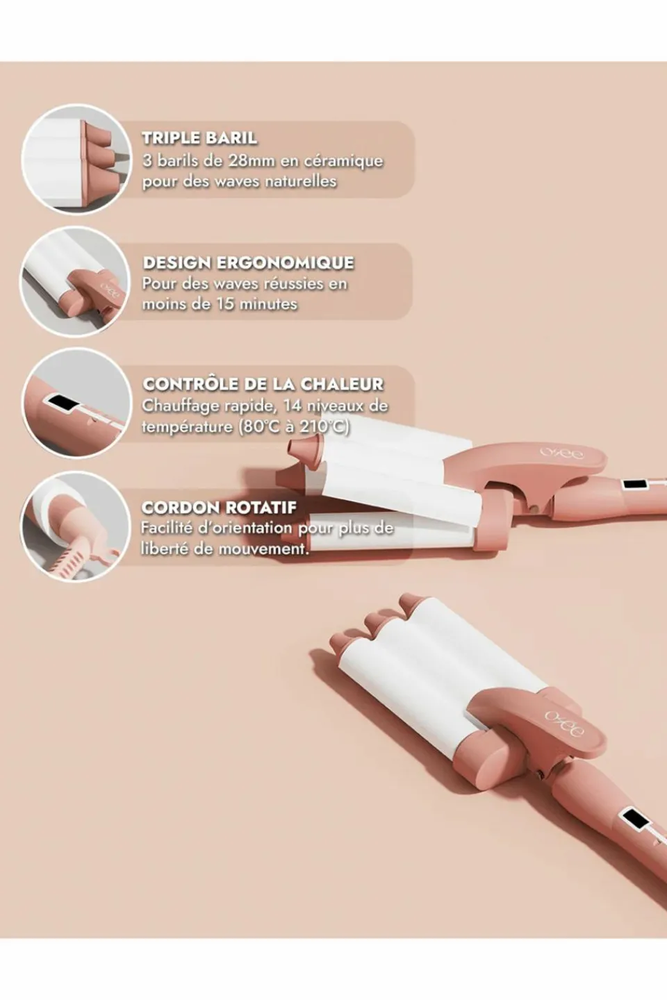 • Waves uniques : la largeur du triple-baril et le revêtement en céramique font toute la singularité du Waver Osée ! Il apporte aux cheveux plus de volume, de brillance et de douceur en un rien de temps.