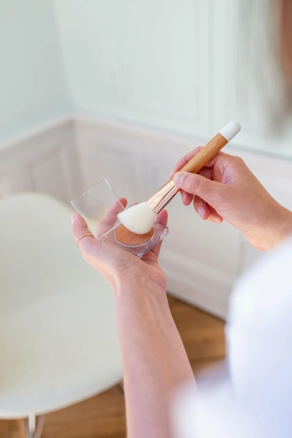 Prélevez une petite quantité de blush avec votre pinceau et tapotez légèrement pour enlever l’excédent. Appliquez le blush sur vos pommettes en remontant vers les tempes. Estompez bien pour éviter les démarcations.