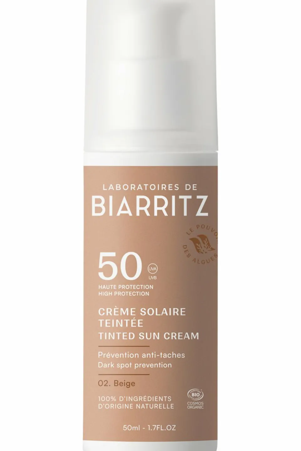Optez pour la Crème solaire teintée visage SPF50 Ivoire des Laboratoires de Biarritz, certifiée Bio, un soin naturel conçu pour offrir une haute protection solaire au quotidien, même pour les peaux les plus sensibles.