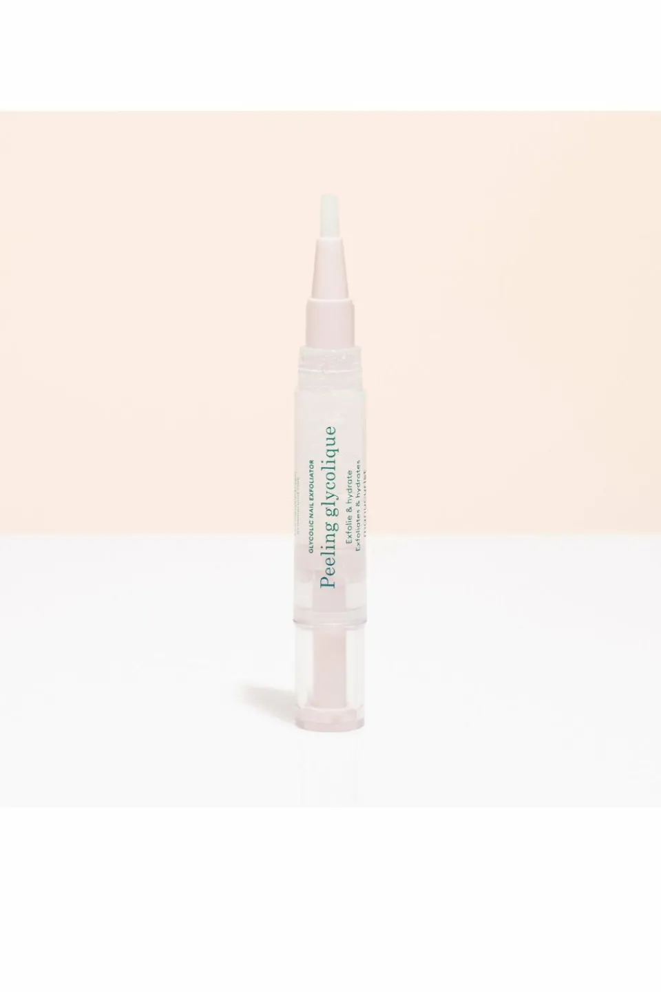 1. Peeling glycolique : répartir la matière sur la surface de l’ongle nu, puis masser jusqu’à pénétration pour exfolier en douceur. La formule s’absorbe naturellement, sans besoin de rinçage ni retrait.