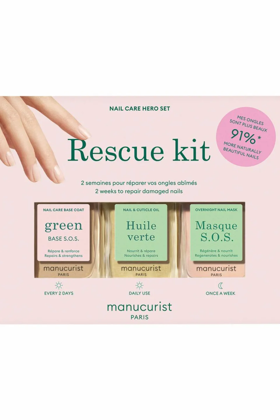 Un trio de soins ongles intensifs pour des ongles abîmés à très abîmés. Retrouvez dans ce kit : la Base S.O.S, le Masque S.O.S et l’Huile Verte.