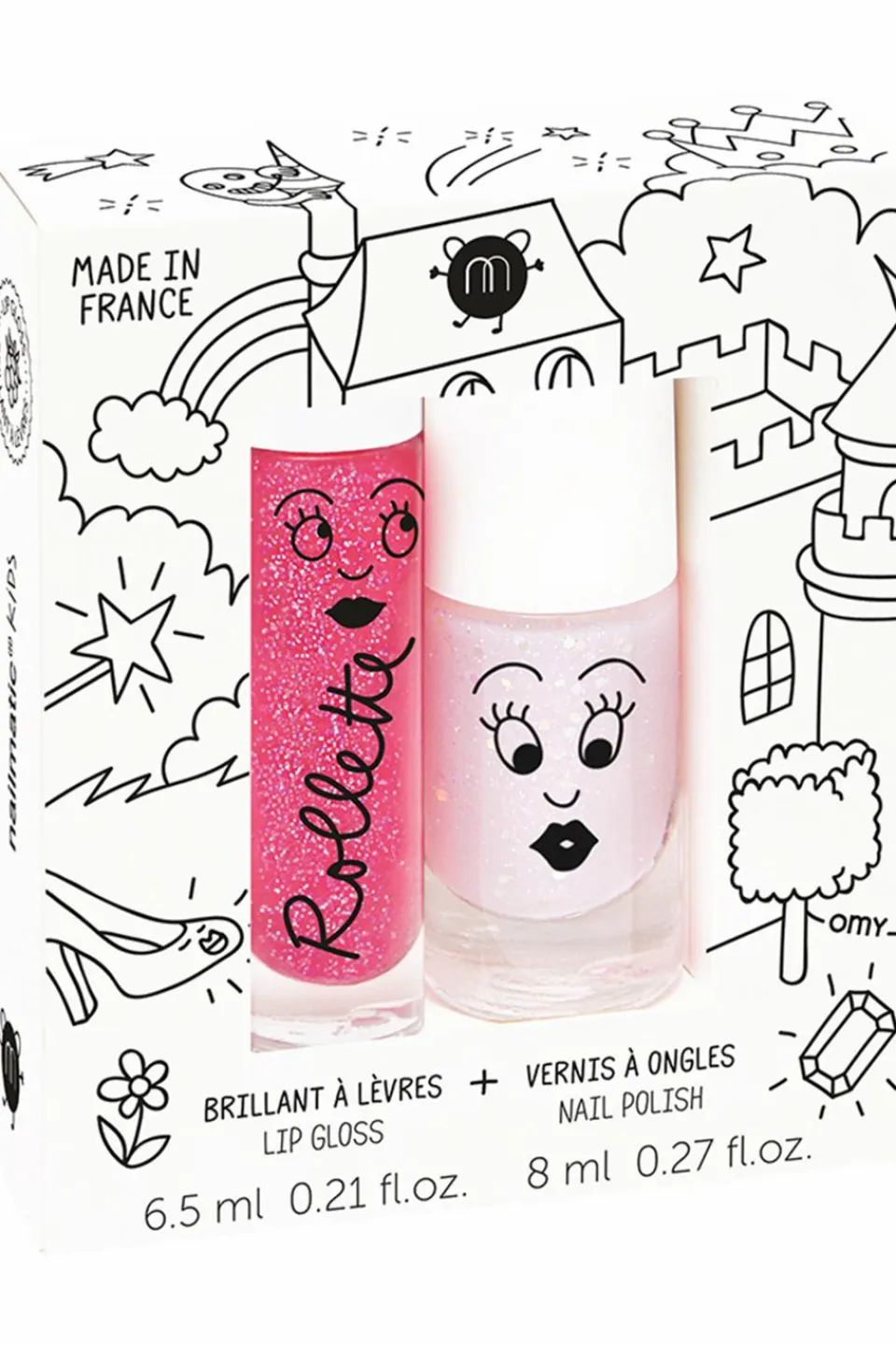 – Un vernis Polly (rose transparent paillettes) à base d’eau pour enfant, à enlever avec de l’eau tiède savonneuse. Secouez-le avant chaque application pour une texture plus homogène.