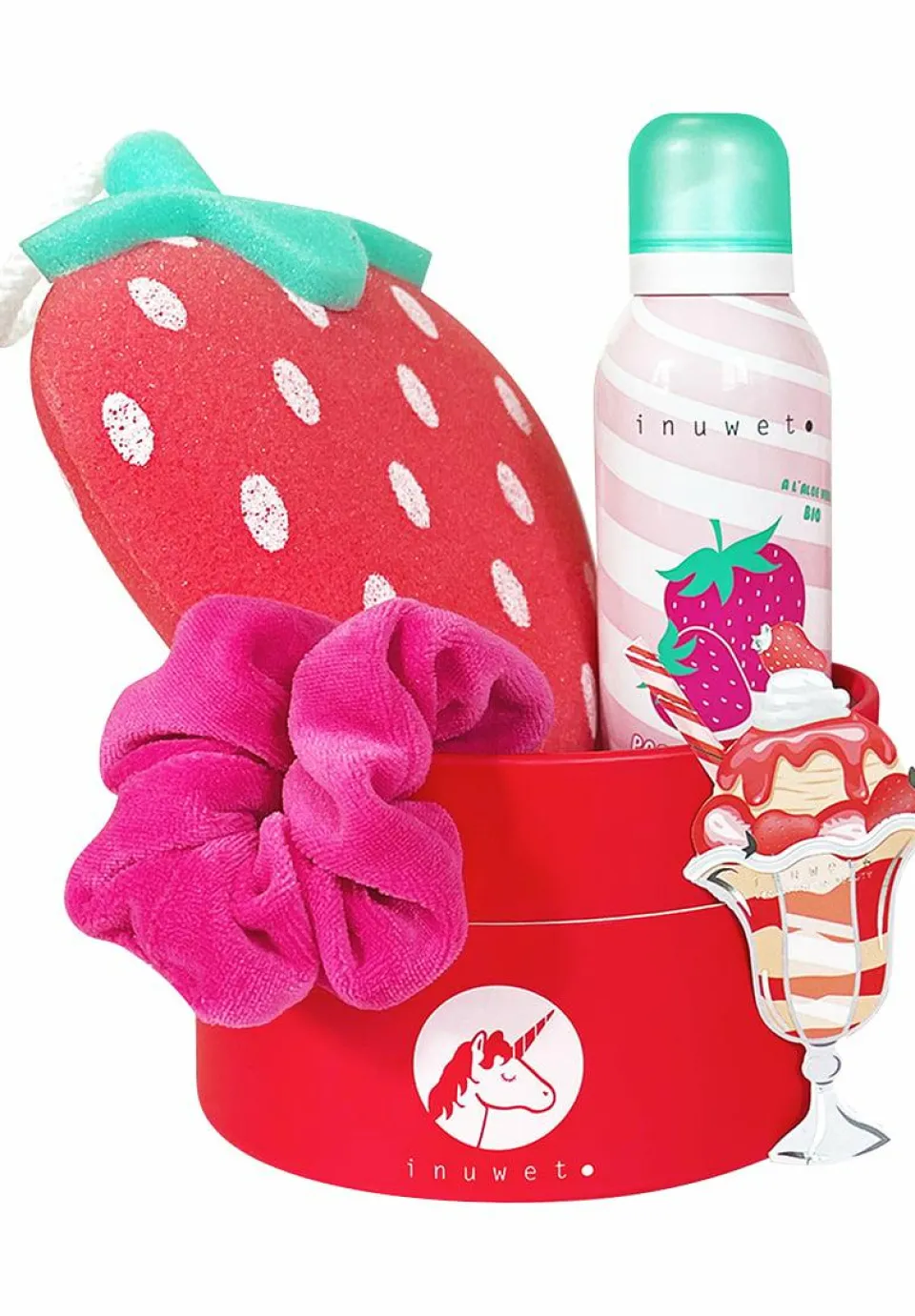 Un coffret bain composé d’une mousse de douche parfumée à la fraise, d’une éponge géante en forme de fraise, d’un chouchou et d’un stickers.