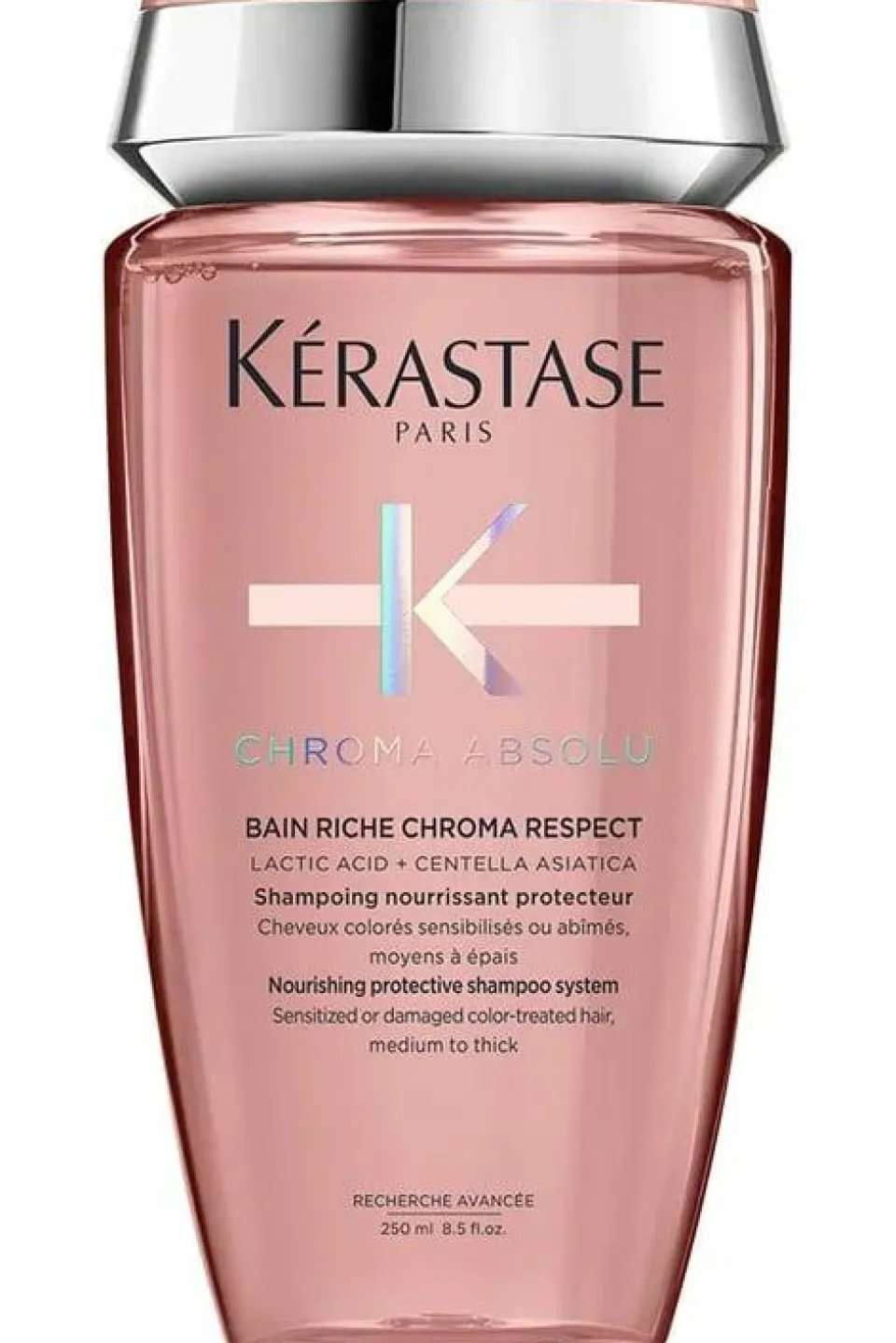 Le Bain Riche Chroma Respect de Kérastase est un shampoing protecteur nourrissant pour les cheveux colorés sensibilisés ou abîmés. Sa formule gel transparent rose clair nettoie et nourrit les cheveux tout en respectant et préservant la couleur de l’affadissement des cheveux moyens à épais. Enrichi en acide lactique et en Centella Asiatica, ce shampooing aide à réduire la porosité de la fibre capillaire pour une préservation maximale de la couleur et réduit l’apparition des frisottis.