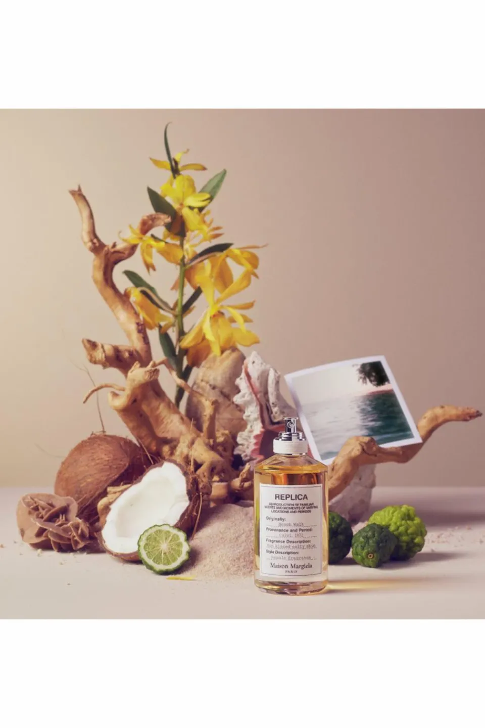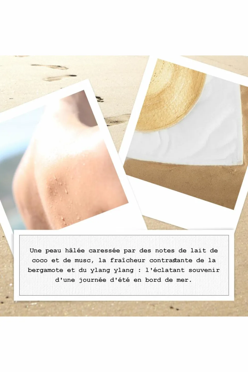 Beach Walk évoque le contraste entre la fraîcheur des embruns et la chaleur du sable sur la peau. Un contraste porté par des notes de tête fraîches – la Bergamote et le Citron -, associées à un accord « solaire » très floral composé d’Ylang-ylang, et d’Héliotrope poudré. En fond, le Musc blanc apporte une douceur presque maternelle au lait de coco pour un rendu très « fluide ».