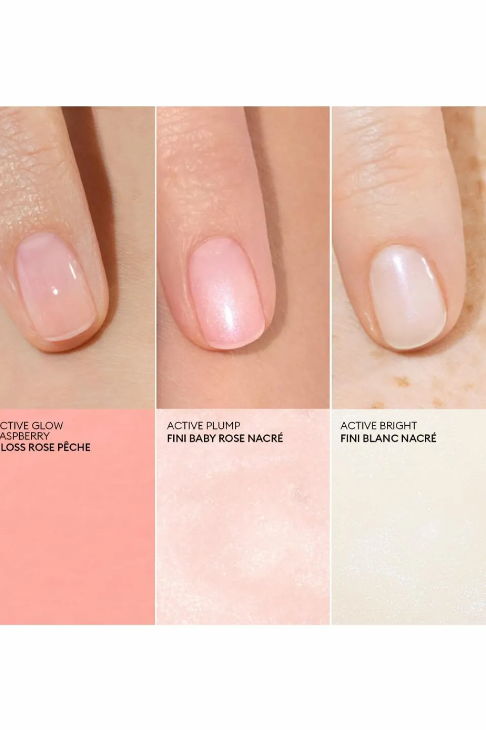 – Active Plump : effet repulpant baby rose avec un fini nacré. Enrichi en collagène végétal et extraits de pêche (8 ml)
