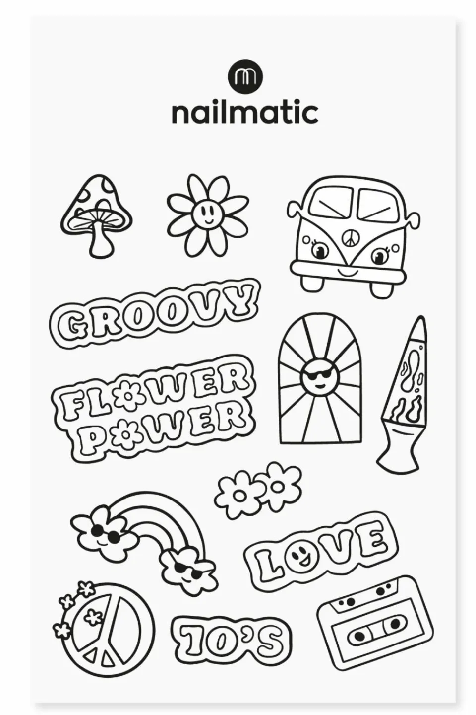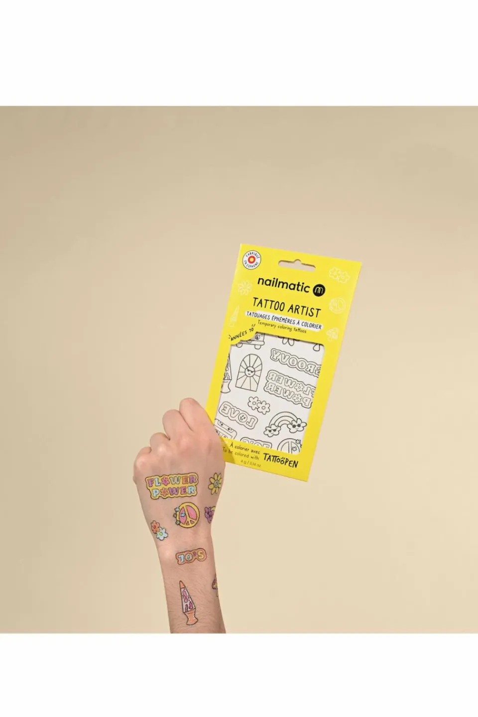 Explorez les années 70 avec notre planche de tatouages éphémères à colorier de la gamme Tattoo Artist.