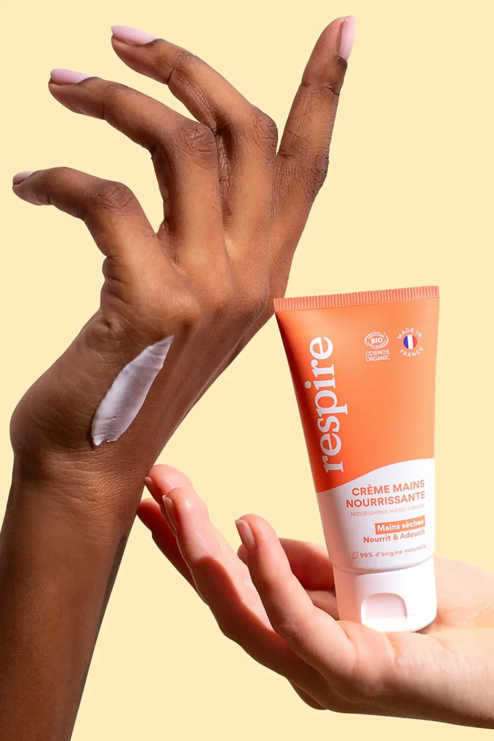La crème mains nourrissante Respire est à 99% d’origine naturelle, certifiée bio, vegan et faite en France. Enrichie en actifs aux propriétés nutritives et apaisantes, elle nourrit, adoucit et protège les mains sèches et les ongles.