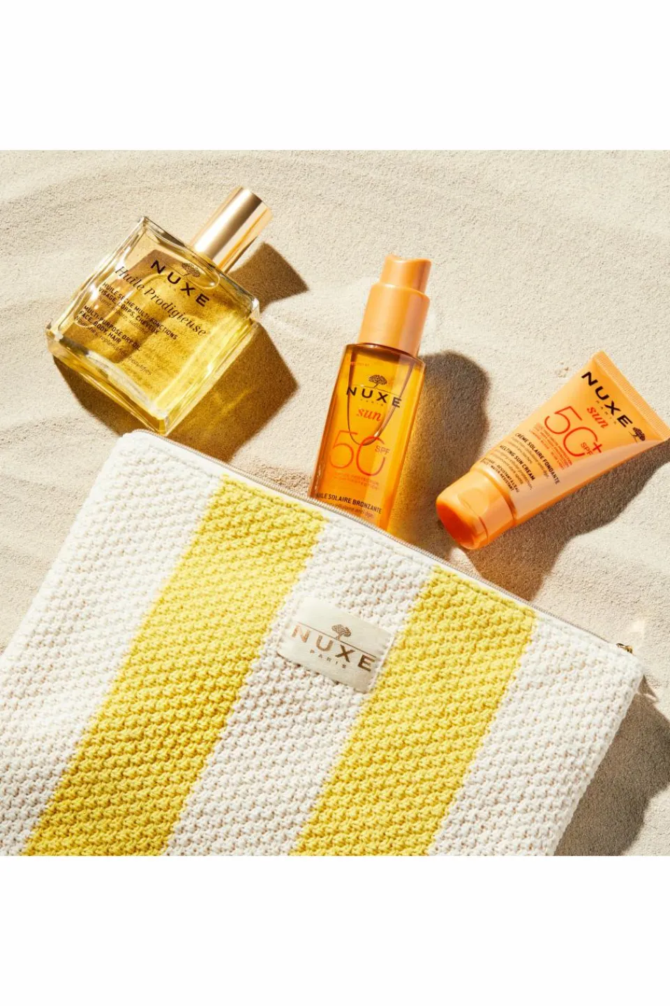 Laissez vous séduire par cette trousse solaire rayée jaune et beige qui réunit les 3 incontournables de l’été pour une peau protégée et sublimée.