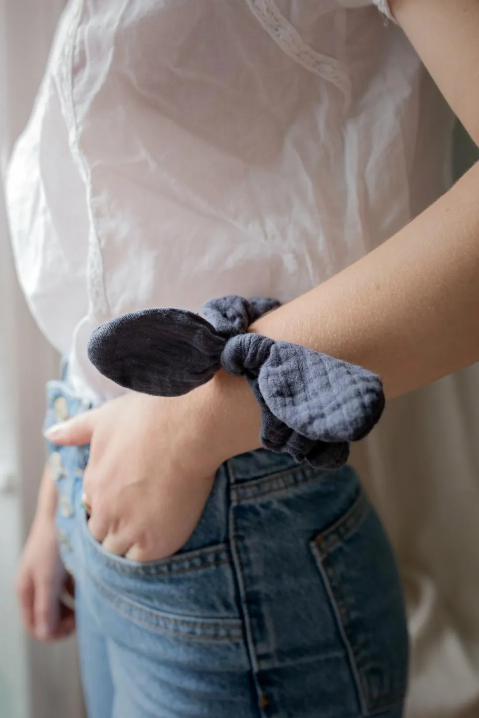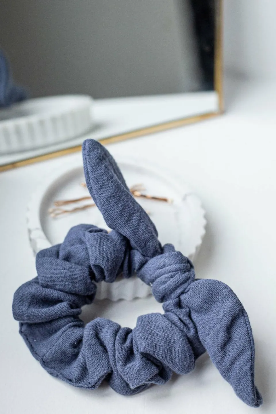 Chouchou en gaze de coton orné d’un nœud. A nouer sur une queue de cheval ou un chignon pour une coiffure rétro !