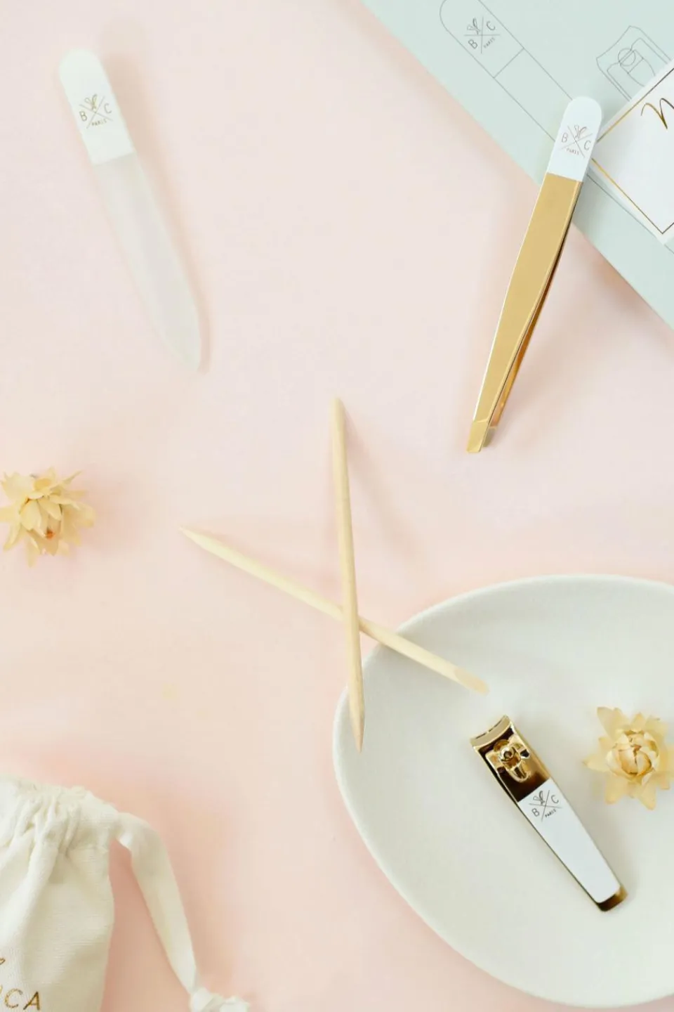 Le set manucure Bachca comprend les 4 outils essentiels pour une manucure toujours parfaite : un coupe-ongle, une pince à épiler, 2 bâtonnets cuticules et une lime à ongles en verre. Déclinés en doré et blanc, ils deviennent de vrais objets de décoration qui s’exposent dans la salle de bains !