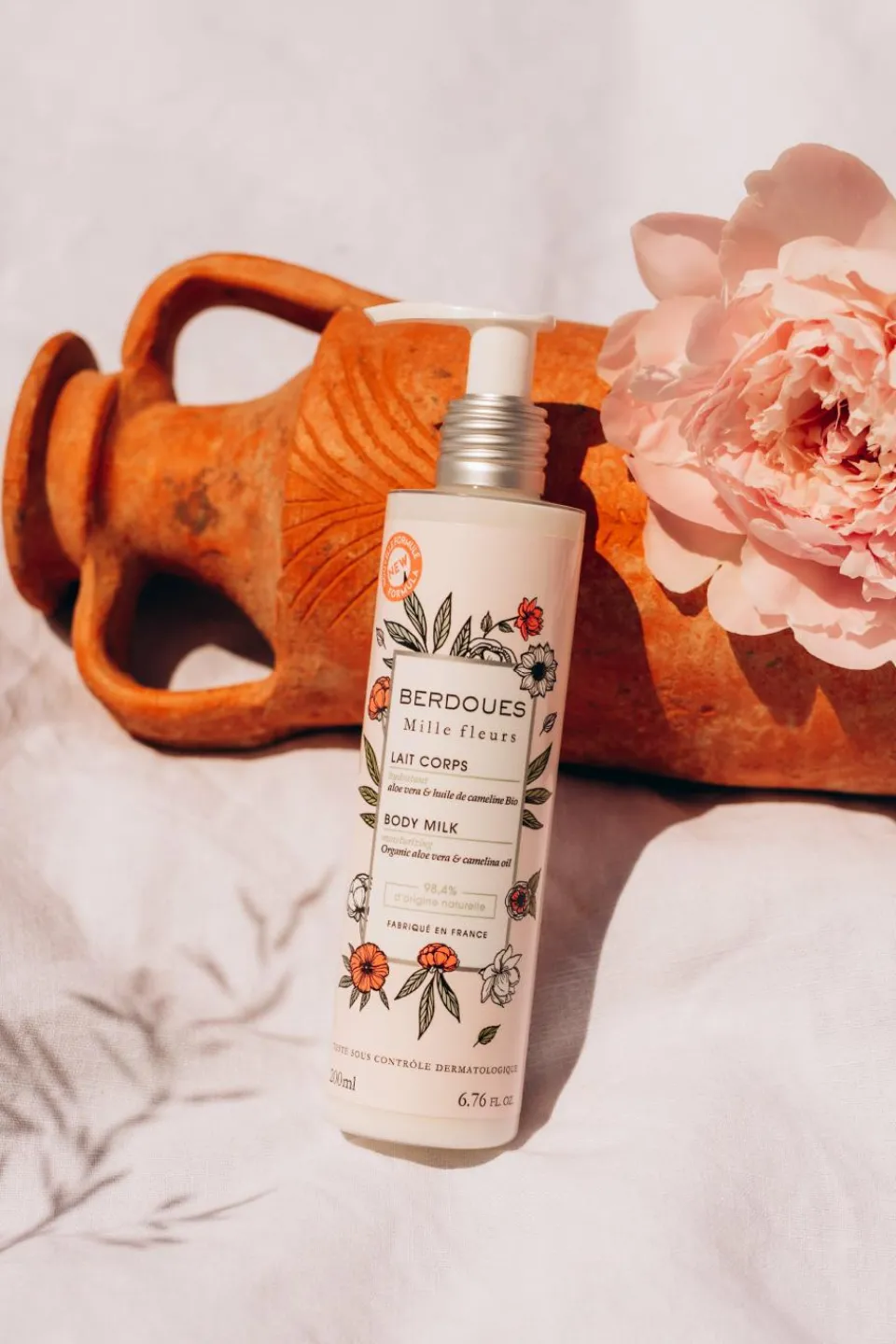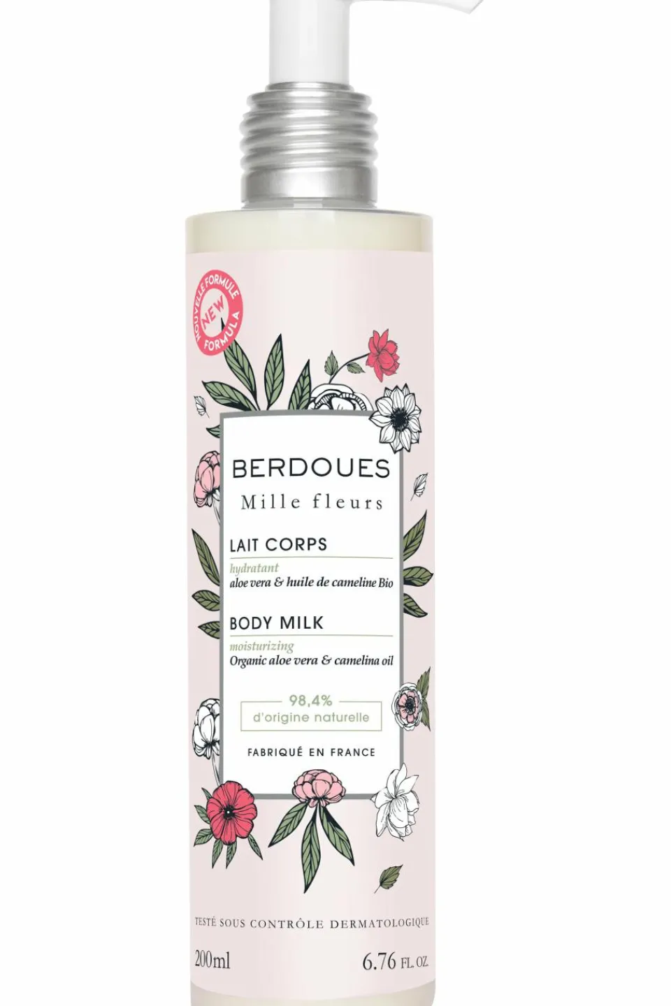 Enrichi du complexe d’aloe vera, beurre de karité et huile de cameline bio aux propriétés régénérantes, ce lait corps à la texture fondante, pénètre rapidement et parfume délicatement la peau de la signature olfactive Mille Fleurs de Berdoues.