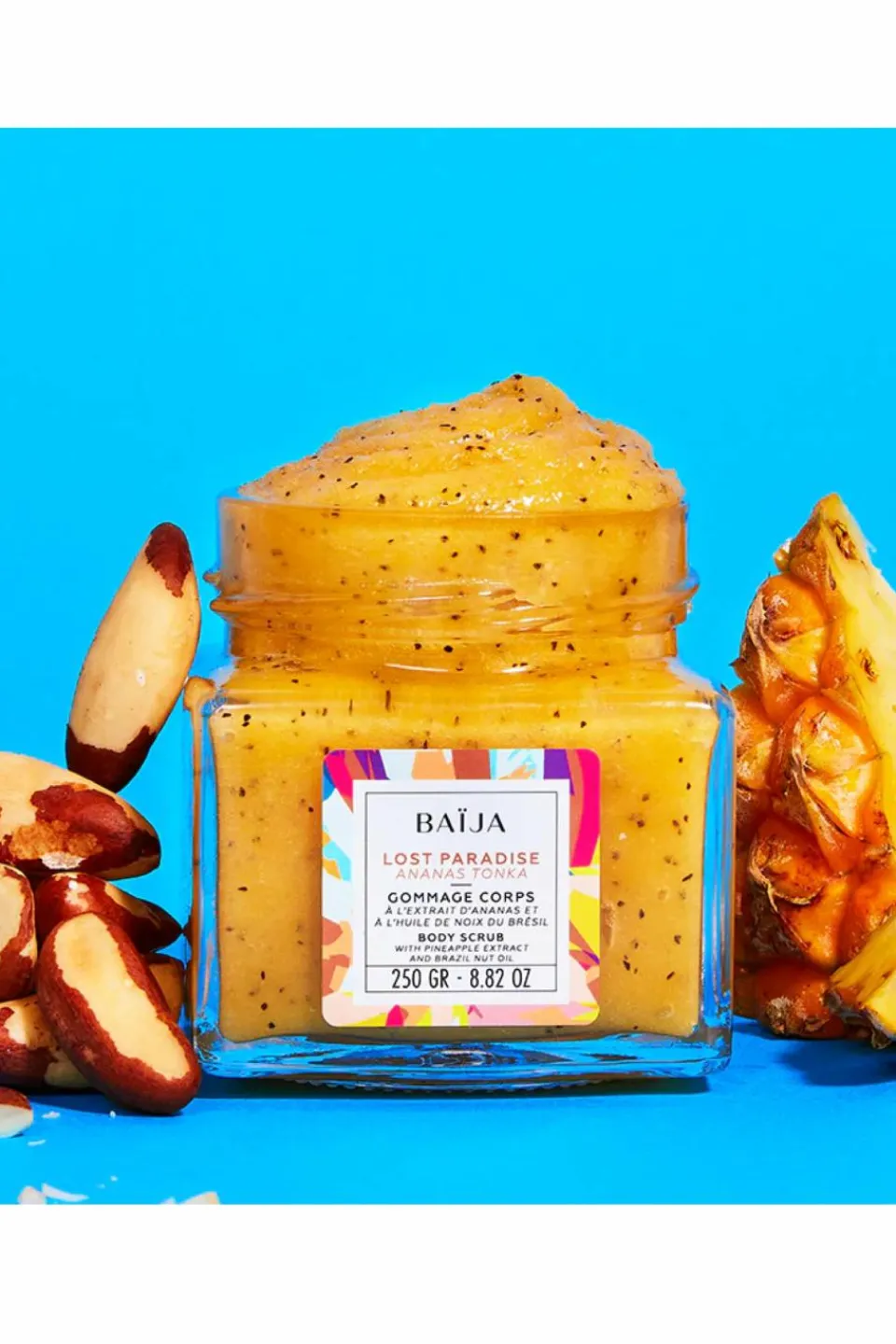 Sa texture onctueuse associe le sel de mer et les coques de Noix de Coco pour exfolier en douceur la peau et la débarasser de ses impuretés. L’extrait d’Ananas illuminateur et l’huile de Noix du Brésil nourrissante la subliment dès la première utilisation. Son parfum de fruits frais et de fleurs solaires invite au voyage, à la recherche d’un paradis exotique.