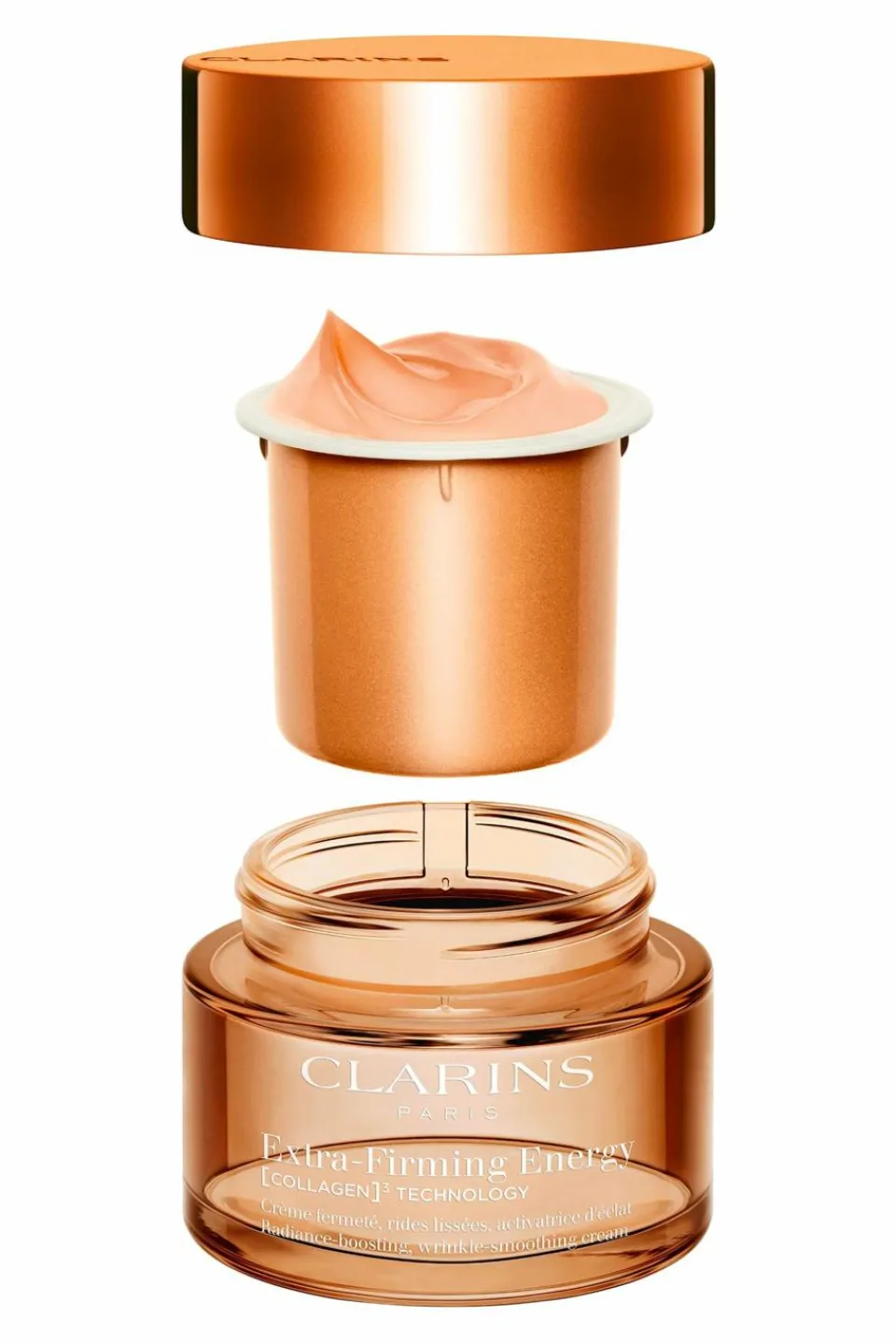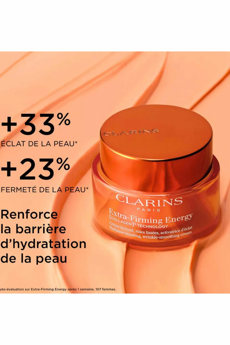 Pour améliorer la fermeté de la peau, Clarins a créé une technologie exclusive [COLLAGEN]³ TECHNOLOGY* qui associe 3 puissants actifs pro-collagène pour agir contre la perte de fermeté de la peau :