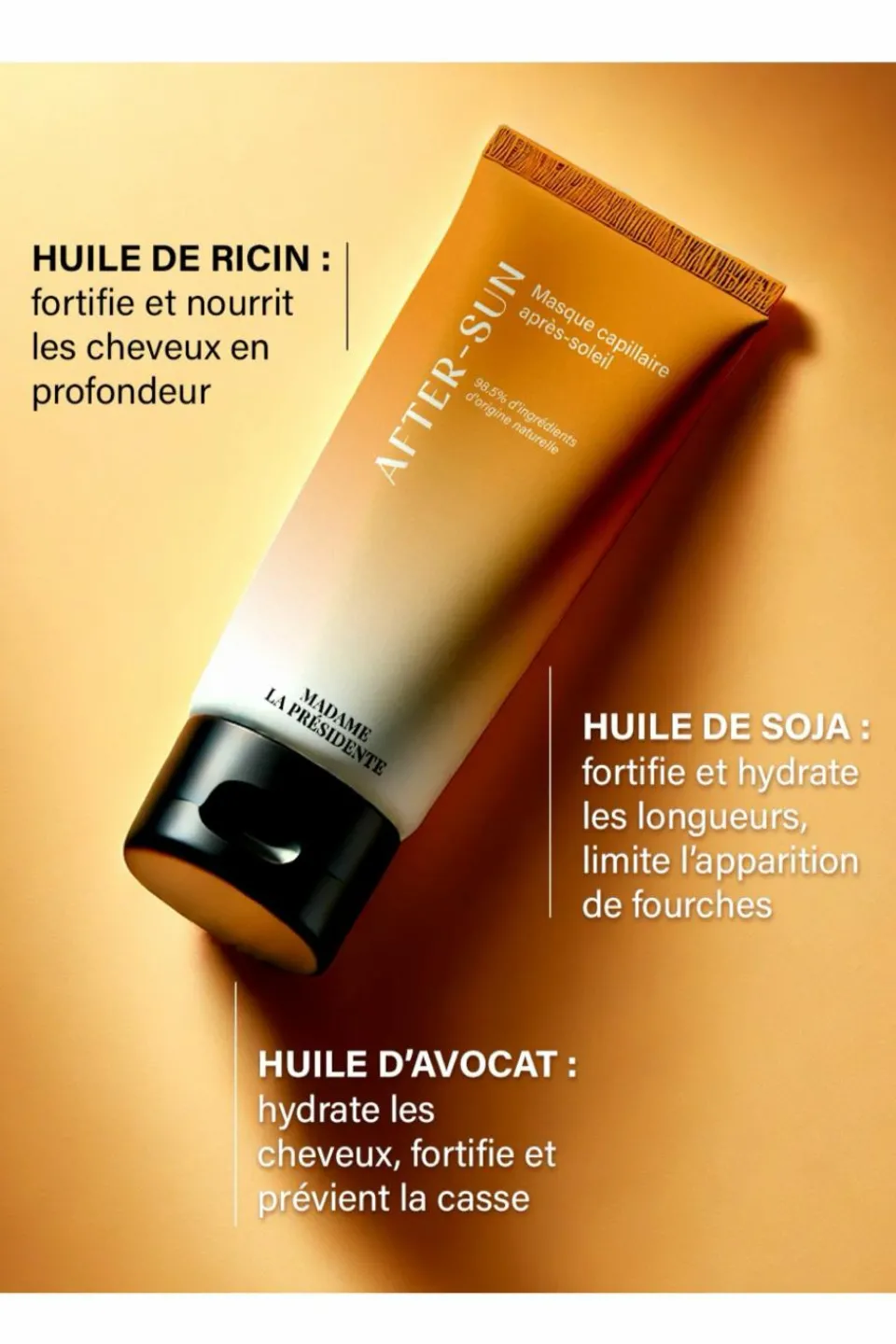 Le masque après soleil Madame La Présidente est un soin capillaire 2 en 1 conçu pour réparer en profondeur les cheveux après une exposition au soleil.