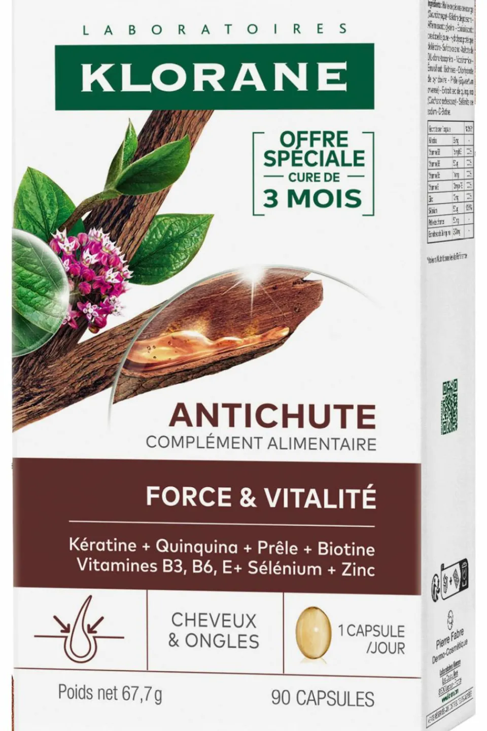 Cette cure de complément alimentaire cheveux Antichute de Klorane aide à prévenir la chute des cheveux et à apporter force et vitalité aux cheveux et aux ongles.