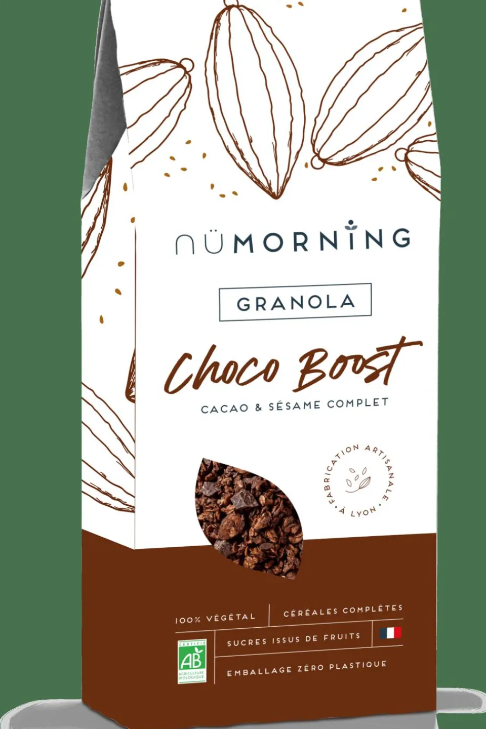 Le granola Choco Boost de nüMorning séduira les amateurs de chocolat noir avec ses notes cacaotées rehaussées par le sésame grillé.