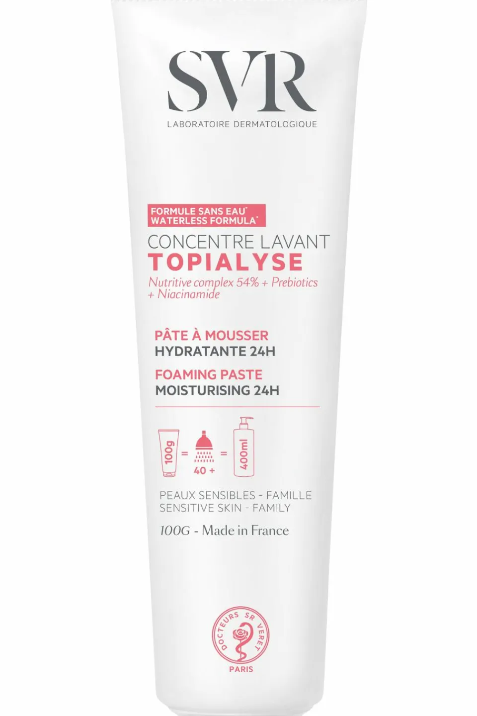 Formulé sans eau, ce concentré lavant représente l’équivalent d’un gel lavant TOPIALYSE 400ml dans un tube de seulement 100g grâce à sa texture innovante !