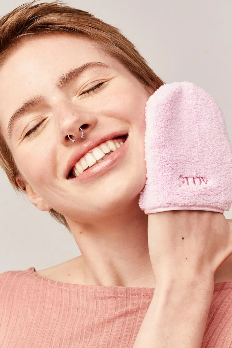 Humidifiez le gant GLOV et démaquillez-vous en effectuant de légers mouvements circulaires.