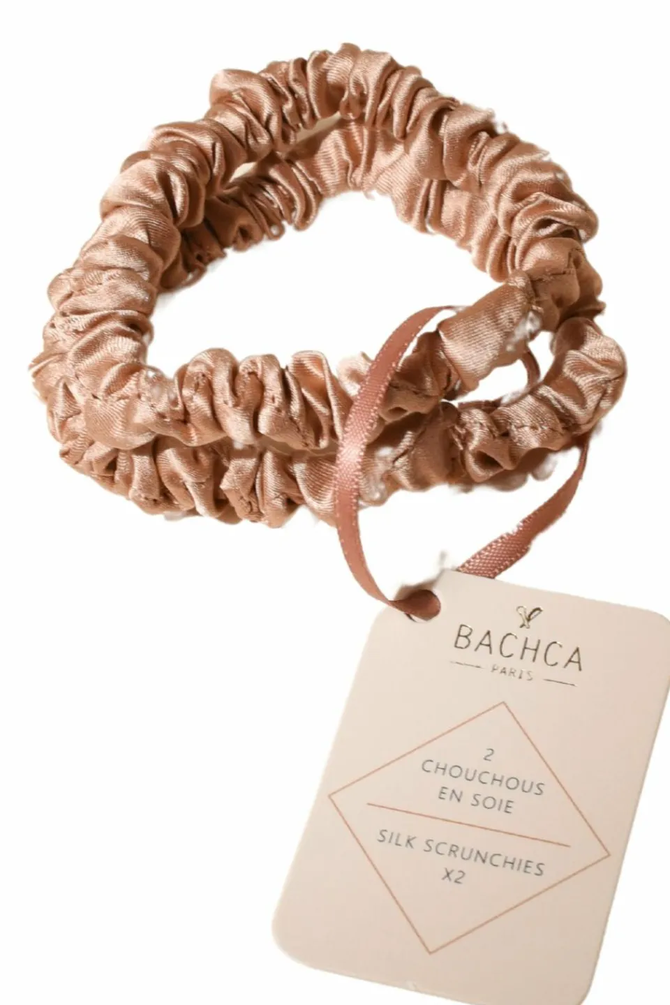 Ce duo de chouchous en soie rose permet de réaliser tous les souhaits de coiffure tout en prenant soin des cheveux grâce à sa composition 100% soie.