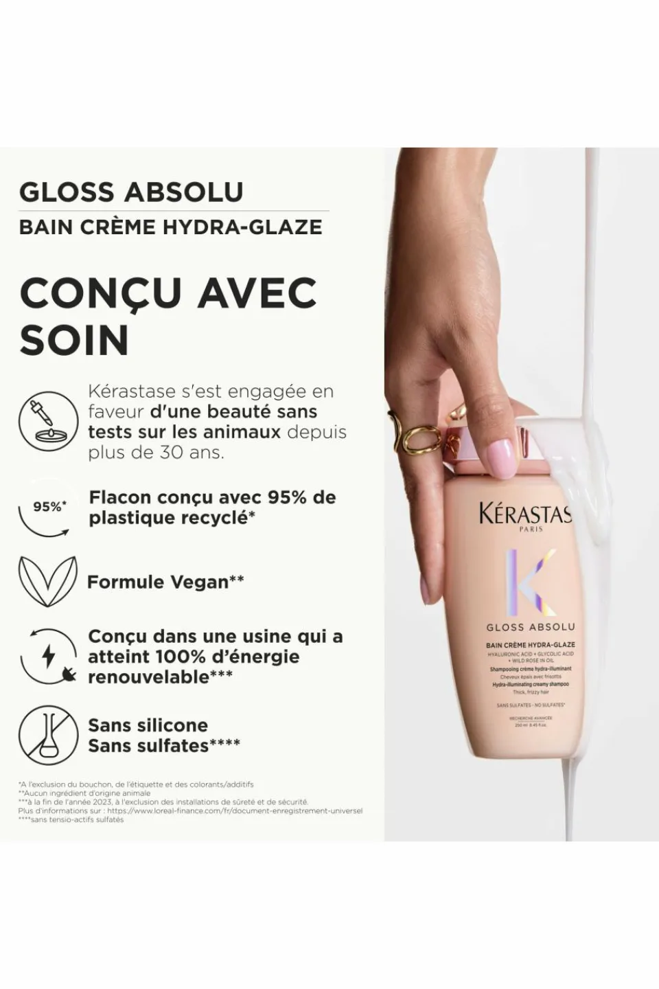 Pour maximiser les résultats, combinez avec le reste de la gamme gloss absolu. Commencez avec le bain hydra-glaze si vous avez les cheveux fins ou avec le bain crème hydra-glaze si vous avez les cheveux épais, pour une brillance saine & durable. Complétez avec le soin fondant insta glaze pour une légèreté absolue ou le masque hydra-glaze pour une nutrition instantanée. Protégez vos cheveux de la chaleur, des frisottis et de l’humidité tout en apportant une douceur absolue avec le soin frizz glaze-cream. Sublimez vos cheveux avec l’huile ultra-légère glaze drops pour une touche finale de brillance et enfin parfumez vos cheveux avec le parfum cheveux gloss absolu.