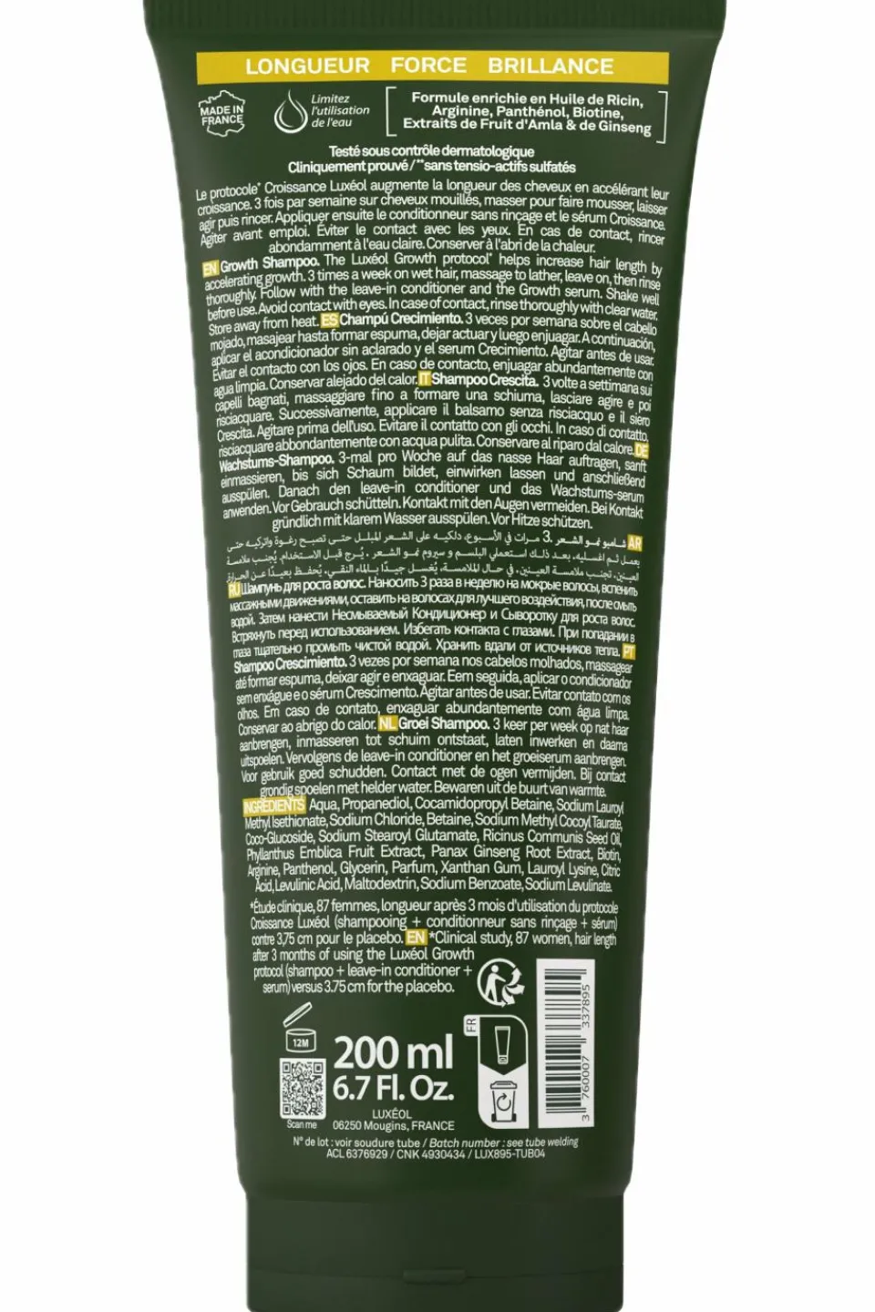 Conseils d’utilisation: Appliquer 3 fois par semaine sur cheveux mouillés. Masser jusqu’à l’apparition d’une mousse dense. Laisser agir quelques minutes avant de rincer. Appliquer ensuite le conditionneur sans rinçage Croissance et quotidiennement le Sérum Croissance.