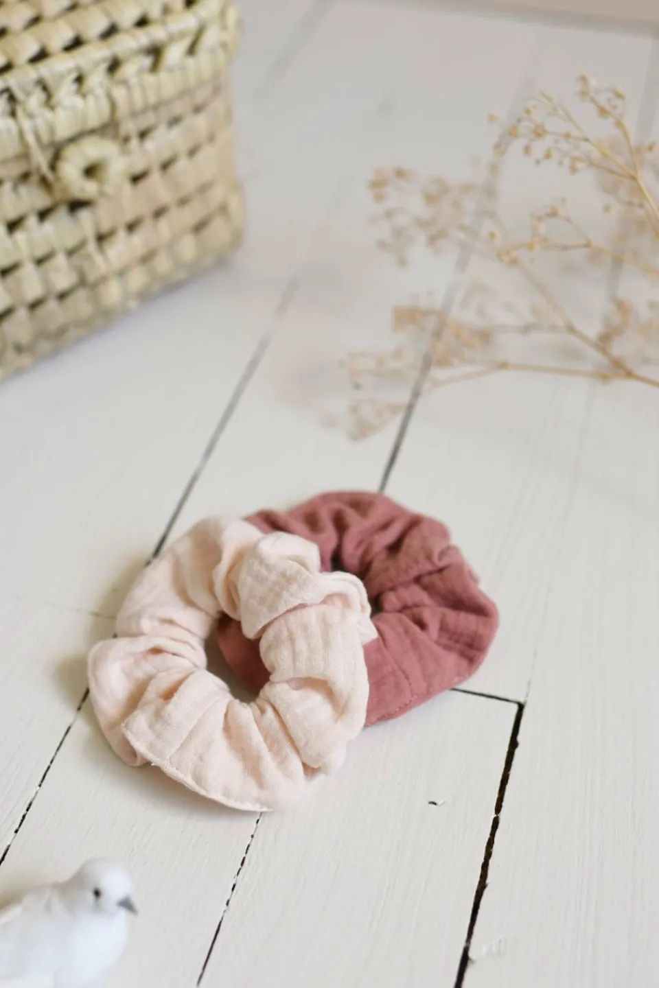 Ce lot de 2 chouchous en gaze de coton est composé d’un chouchou écru et d’un chouchou terracotta.