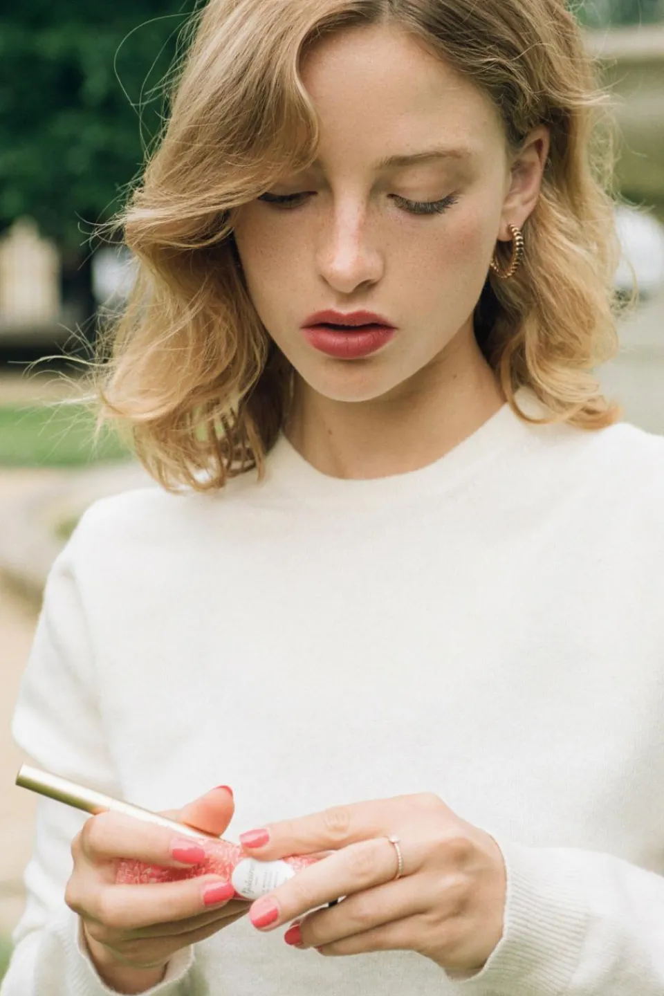 – Daphné est un rouge nude, parfait pour une touche de couleur sans trop en faire. Le « je ne sais quoi » qui fait tout.