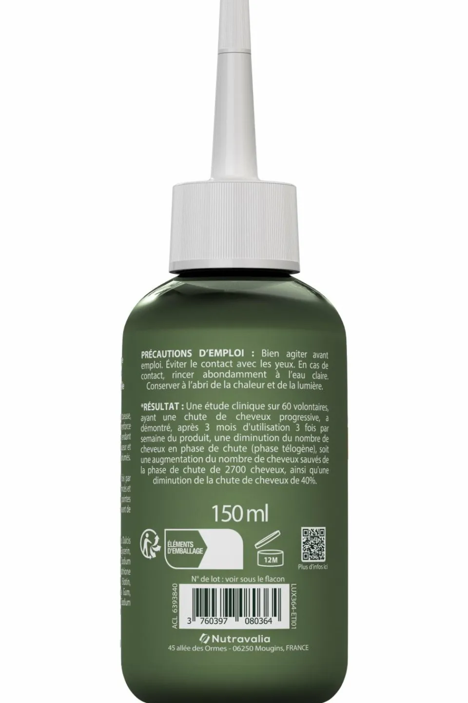 *Une étude clinique sur 60 volontaires, ayant une chute de cheveux progressive, a démontré, après 3 mois d’utilisation 3 fois par semaine du produit, une diminution du nombre de cheveux en phase de chute (phase télogène), soit une augmentation du nombre de cheveux sauvés de la phase de chute de 2700 cheveux, ainsi qu’une diminution de la chute de cheveux de 40%.