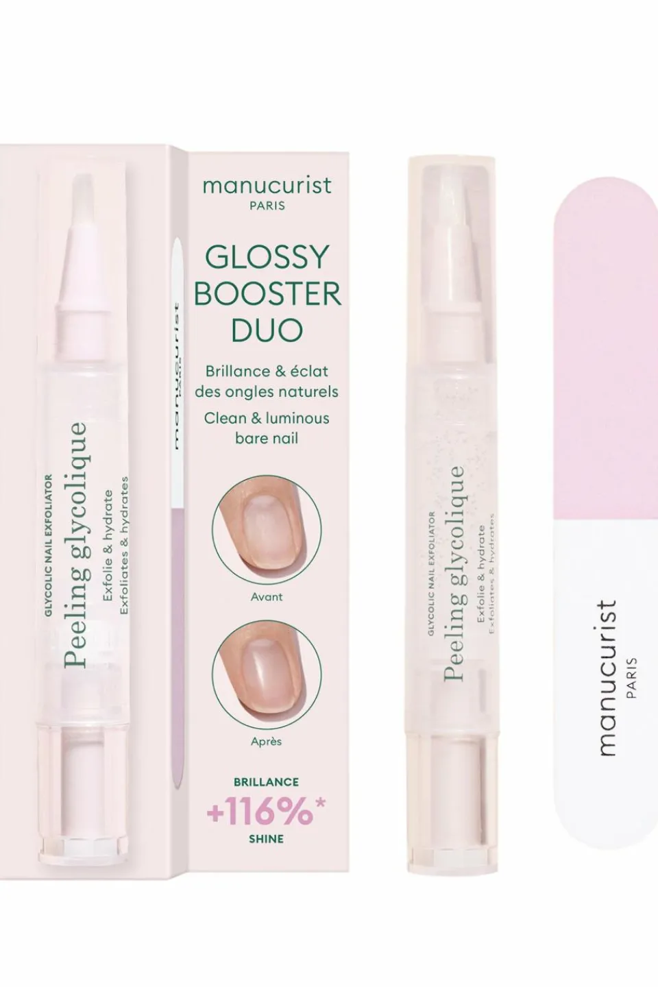 Idéal pour les ongles ternes, le Glossy booster duo combine l’action exfoliante du Peeling glycolique à l’action lissante du Polissoir pour des ongles brillants et éclatants en quelques secondes seulement.