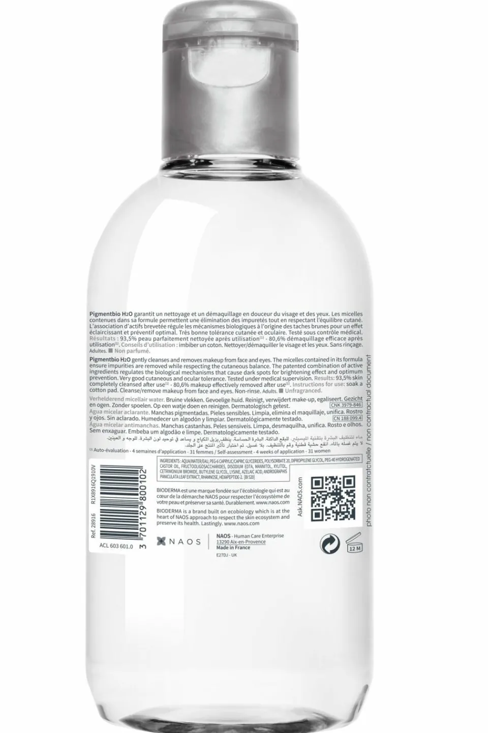 Pigmentbio H2O garantit un nettoyage et un démaquillage en douceur du visage et des yeux. Les micelles contenues dans sa formule permettent une élimination des impuretés tout en respectant l’équilibre cutané.