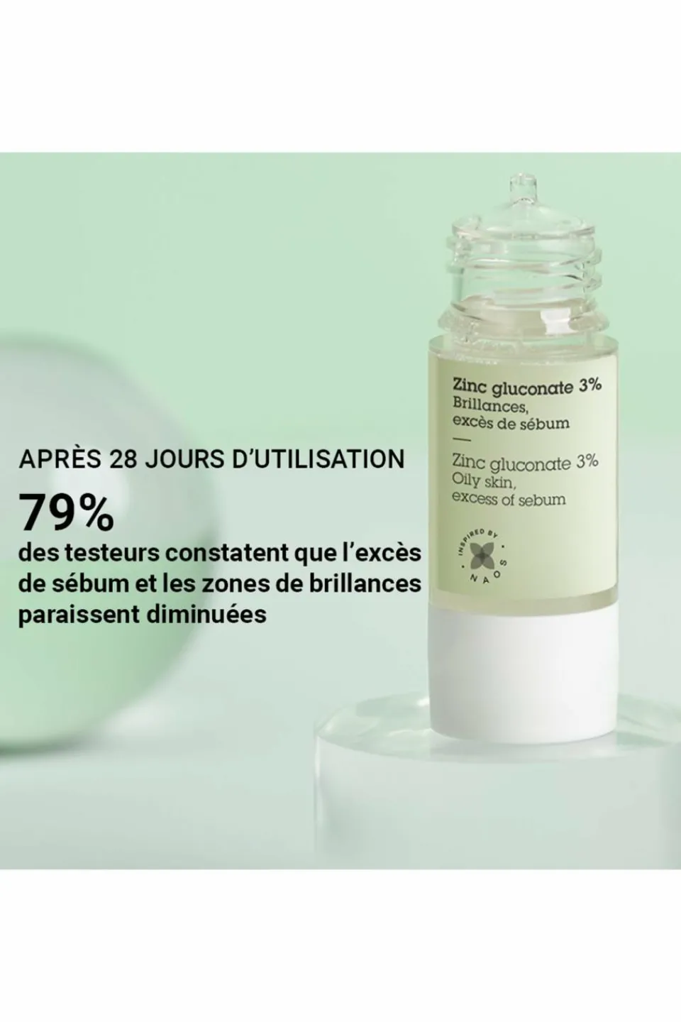 Appuyer à l’arrière du flacon et prélever 4 gouttes. avant de les appliquer sur l’ensemble du visage ou 2 à 3 gouttes pour la zone T.