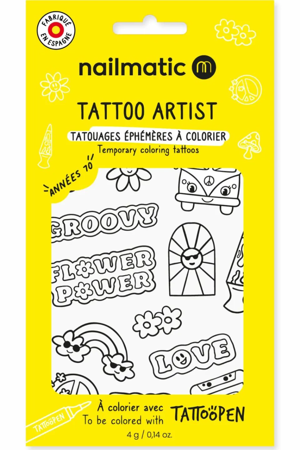 Explorez les années 70 avec notre planche de tatouages éphémères à colorier de la gamme Tattoo Artist.
