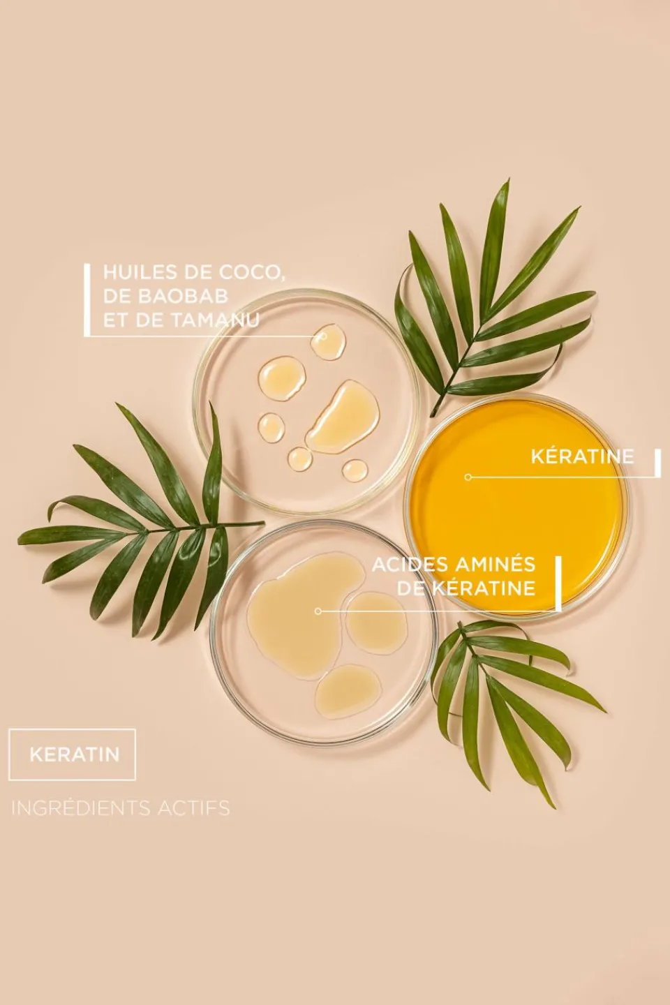 Riche en acides aminés de kératine, huile de baobab et tamanu.